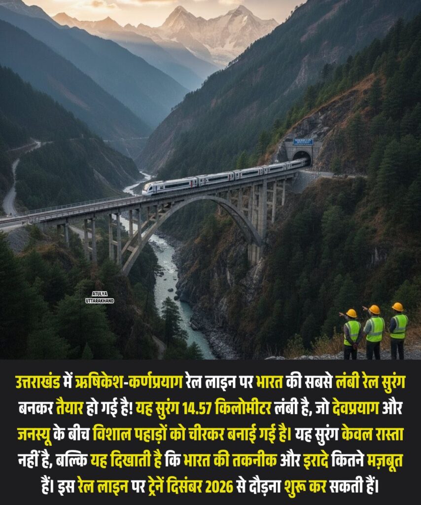 उत्तराखंड में ऋषिकेश-कर्णप्रयाग रेल लाइन पर भारत की सबसे लंबी रेल सुरंग बनकर तैयार हो गई है! यह सुरंग 14.57 किलोमीटर लंबी है, जो देवप्रयाग और जनस्यू के बीच विशाल पहाड़ों को चीरकर बनाई गई है। यह सुरंग केवल रास्ता नहीं है, बल्कि यह दिखाती है कि भारत की तकनीक और इरादे कितने मज़बूत हैं। इस रेल लाइन पर ट्रेनें दिसंबर 2026 से दौड़ना शुरू कर सकती हैं।