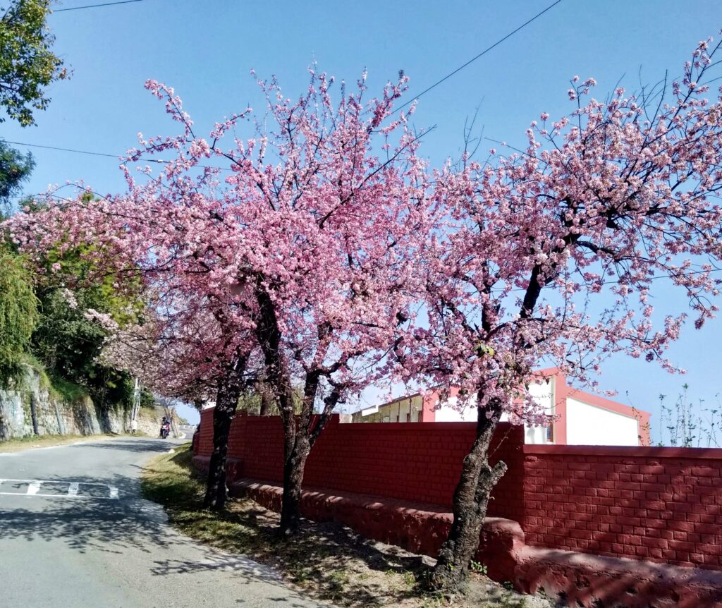 नई टिहरी में कलेक्ट्रेट से कॉन्वेंट स्कूल की ओर जाएं तो स्कूल की ओर की बाउंड्री दीवाल के बाहर एक लाइन में एक दर्जन के करीब वृक्षों पर एक साथ फूल खिल गए। हल्के पिंक रंग के होने के कारण और भी ज्यादा सुंदर लग रहे हैं। दिन भर इन वृक्षों पर सैकड़ो और हजारों की संख्या में मधुमक्खियां मंडराती रहती हैं